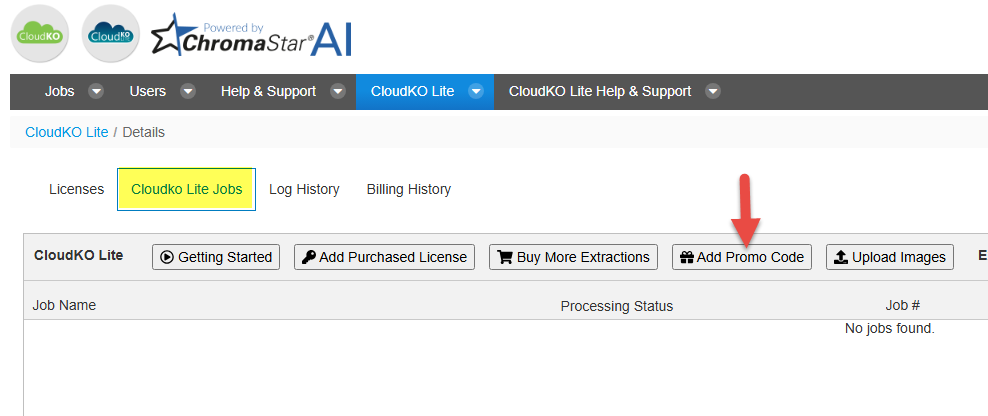 2. Navigate to the CloudKO Lite Jobs tab and click on "Add Promo Code"