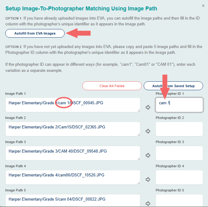 - If you have already uploaded images into EVA, you can autofill the image paths by clicking Autofill from EVA Images, and then fill in the ID column with the photographer's unique identifier as it appears in the image path.