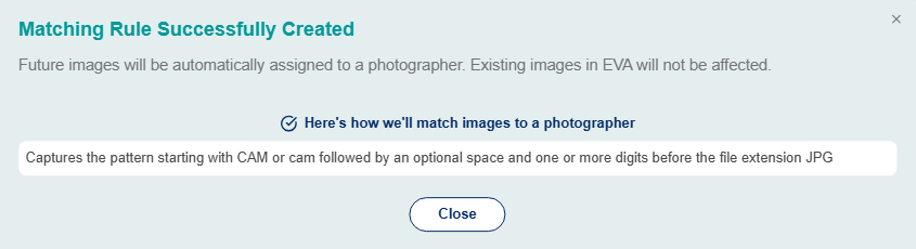 - Once the rule is generated, you will receive this pop up. Only future images will be automatically assigned to a photographer using this matching rule, and not images that were previously uploaded to EVA.